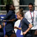 (Photo: France's head coach Corinne Diacre (2nd-L) looks on as France's players take part in a training session. Credit: Lionel Bonaventure/ AFP/ Getty Images)
