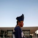 (Photo: An Indigenous man from the Guarani Kaiowa tribe attends a protest to defend indigenous land, outside Brazil"s Supreme Federal Court in Brasilia 26/06/2019. Credit: Reuters)