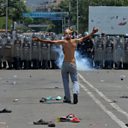 (Photo: A demonstrator gestures in front of Venezuelan national policemen. Credit: Luis ROBAYO / AFP)