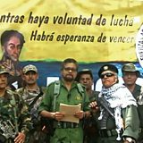 (Photo: Former senior commander Iván Márquez (c) and fugitive rebel colleagues of the dissolved FARC rebel army group announcing that they are taking up arms again.29/8/19. Credit: AFP/Getty Images)