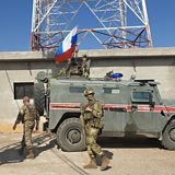 (Photo: Russian soldiers walk past a Russian military police armoured vehicle at a position in the northeastern Syrian city Kobane. Credit: AFP via Getty Images)