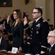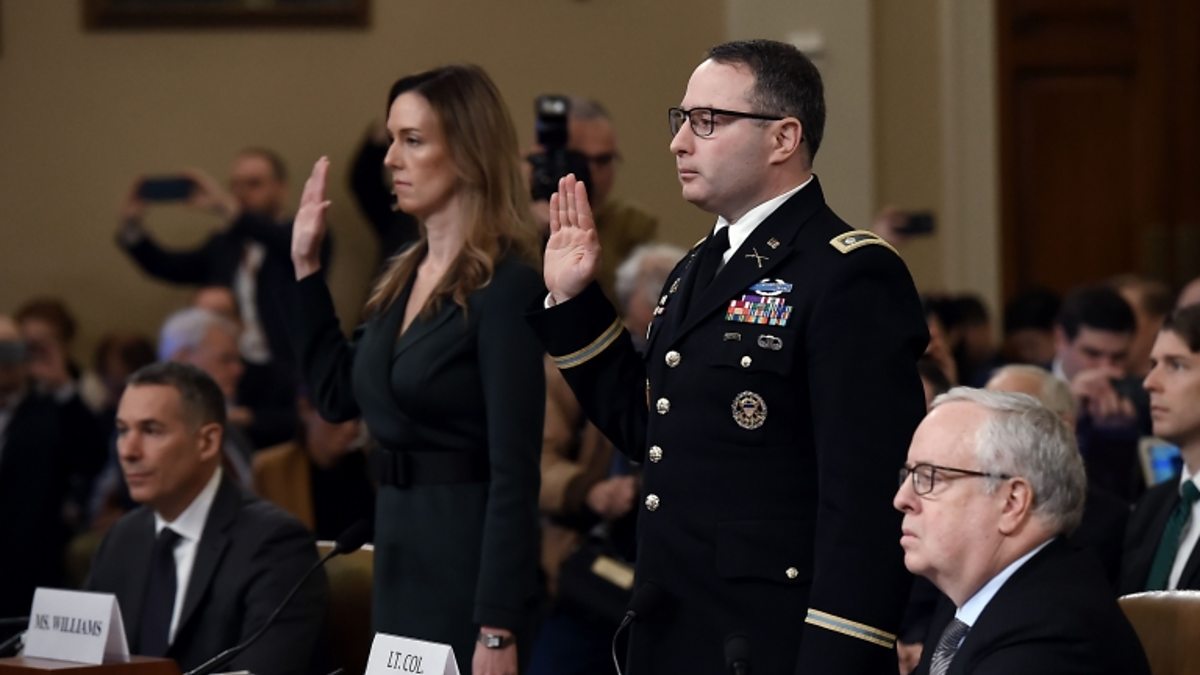 (Photo: National Security Council Ukraine expert Lieutenant Colonel Alexander Vindman and Jennifer Williams, an aide to Vice President Mike Pence are sworn in before the House Intelligence Committee, on Capitol Hill in Washington, DC on November 19, 2019. Credit: Olivier Douliery/AFP)