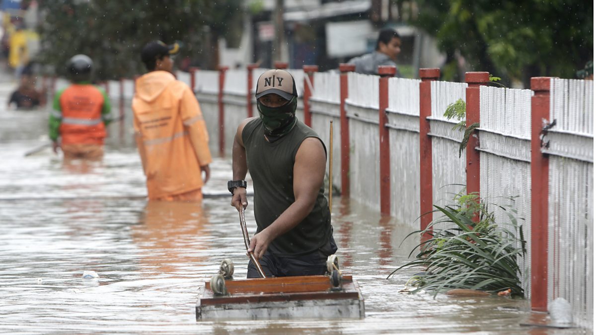 (Photo: A man pushes a cart on a flooded street in Jakarta, Indonesia, 01 January 2020. Credit: EPA/Adi Weda)