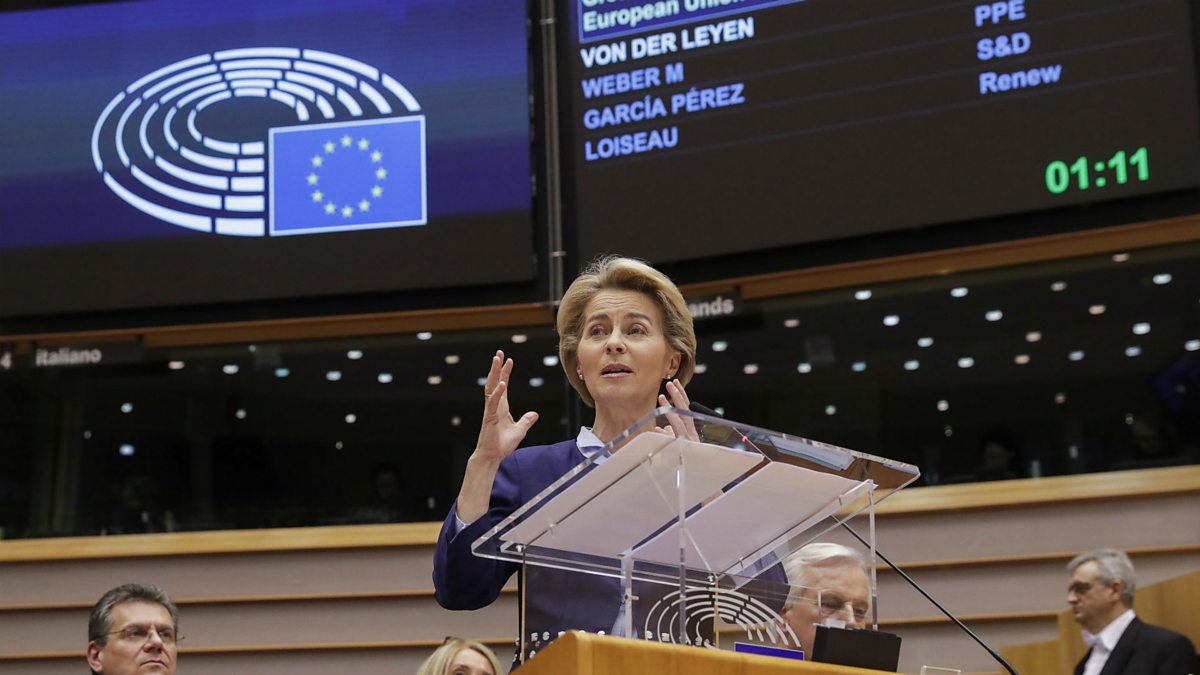 (Photo: European Commission President Ursula Von Der Leyen speaking during a plenary session on BREXIT vote of the European Parliament in Brussels. Credit: Olivier Hoslet/EPA)