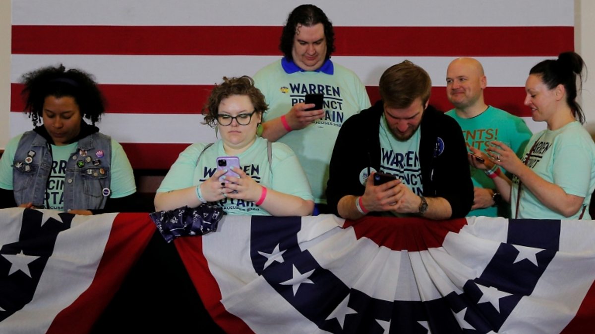 (Photo: Supporters of Democratic presidential hopeful Elizabeth Warren look at their mobile phones before she speaks at her Iowa Caucus rally in Des Moines, Iowa, U.S., February 3, 2020. Credit: Reuters/Brian Snyder)