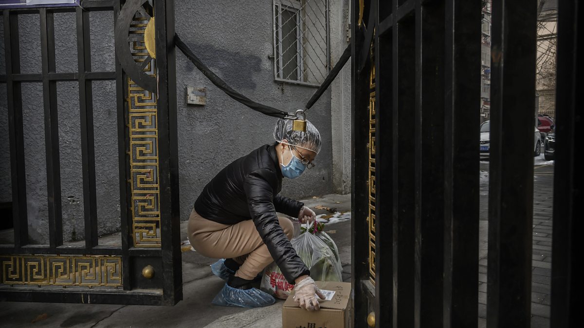 (Photo: A Chinese woman wears a protective mask and clothing as she bends down under the lock on the gate to her apartment compound, as she collects a delivery. Credit: Kevin Frayer/Getty Images)