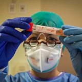 (Photo: A healthcare professional wearing a protective suit and a healthcare mask inspects a vial containing a swab sample in a novel coronavirus Covid-19 testing laboratory in the infectious diseases ward at the Cremona hospital in northern Italy. Credit: EPA/Matteo Corner)