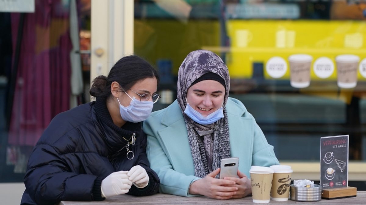 (Photo: Two sisters wearing protective face masks sit outside a coffee shop on March 16, 2020 in Berlin, Germany. Credit: Sean Gallup/Getty Images)
