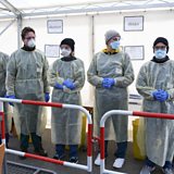(Photo: Medical employees pose at a special corona test center for public service employees in Munich, Germany, March 23, 2020. REUTERS/Andreas Gebert)