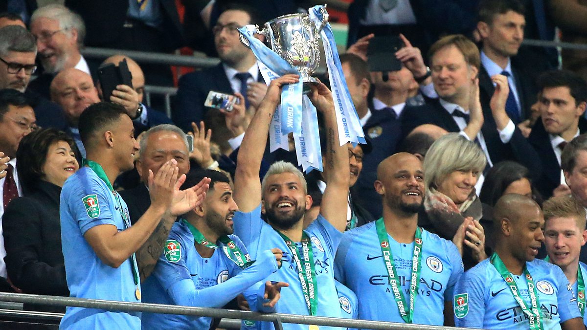 Photo: Sergio Aguero of Manchester City lifts the trophy after winning the Carabao Cup Final (Credit: Getty images)