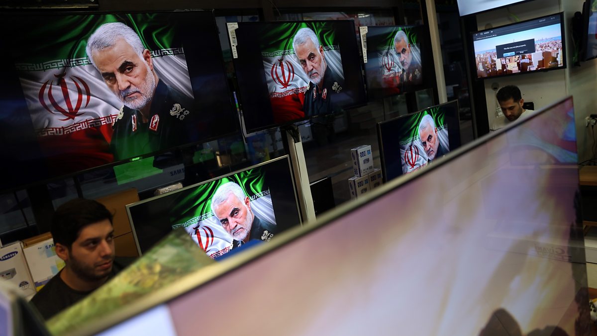 (Image: Qaseem Soleimani on several TV screens. Photo by Majid Saeedi/ Getty Images)