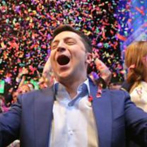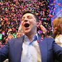 Photo: Volodymyr Zelensky celebrates winning the presidential election. Credit: BBC.)