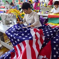 (Picture: Chinese workers sew American flags. Picture credit: Getty Images.)