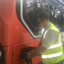 (Picture: A man charges an electric bus. Picture credit: BBC.)