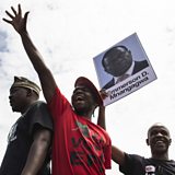 (Image: University of Zimbabwe's students, holding a portrait of former vice president Emmerson Mnangagwa, take part in a demonstration. Credit: AFP/ Getty Images)