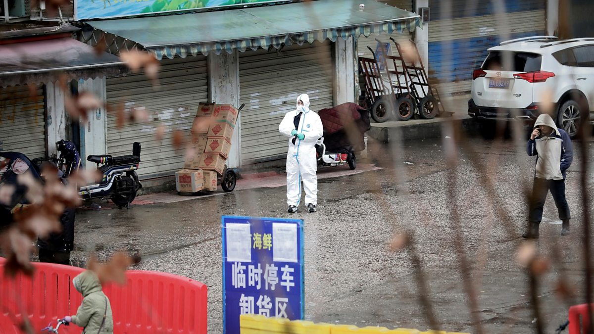 (Picture: Worker in protective suit outside closed Wuhan market. Picture credit: Reuters.)