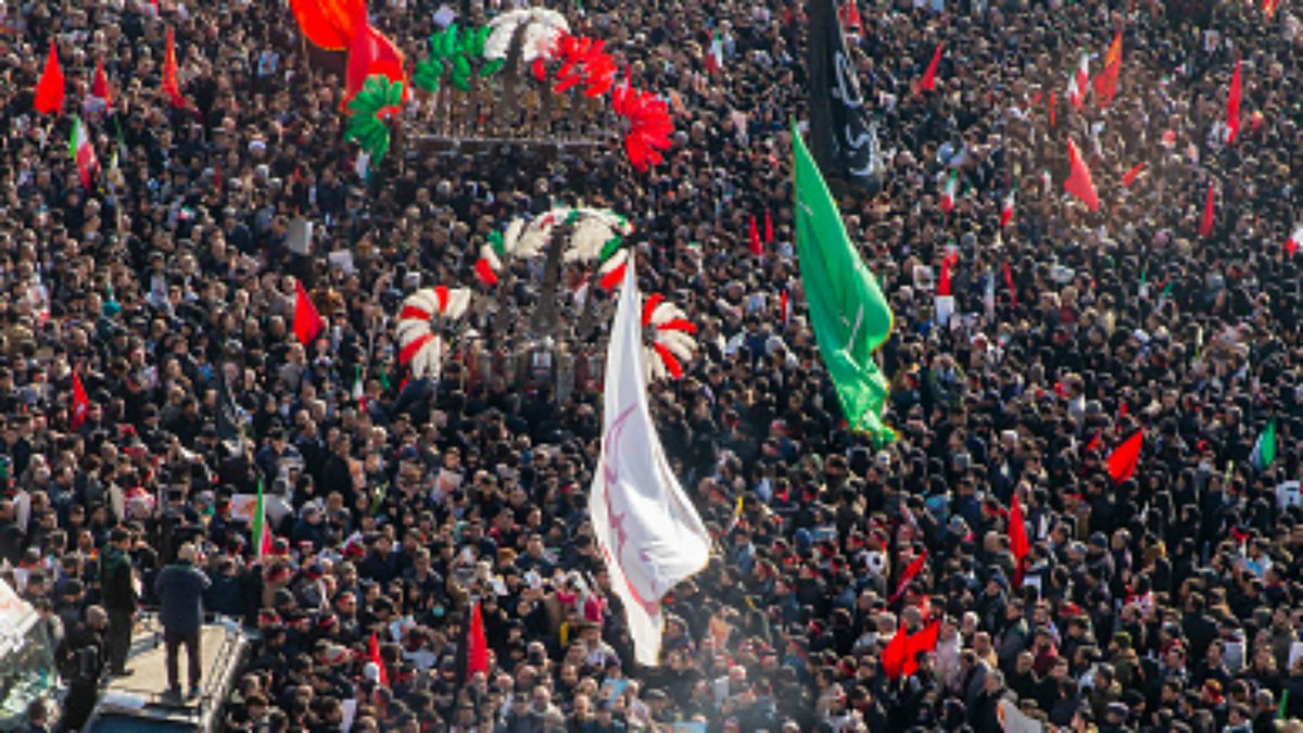 (Picture: Crowds attend the funeral of Iranian Major General Qassem Soleimani and others who were killed in Iraq by a U.S. drone strike on January 6, 2020 in Tehran, Iran. Credit: Majid Saeedi/Getty Images)