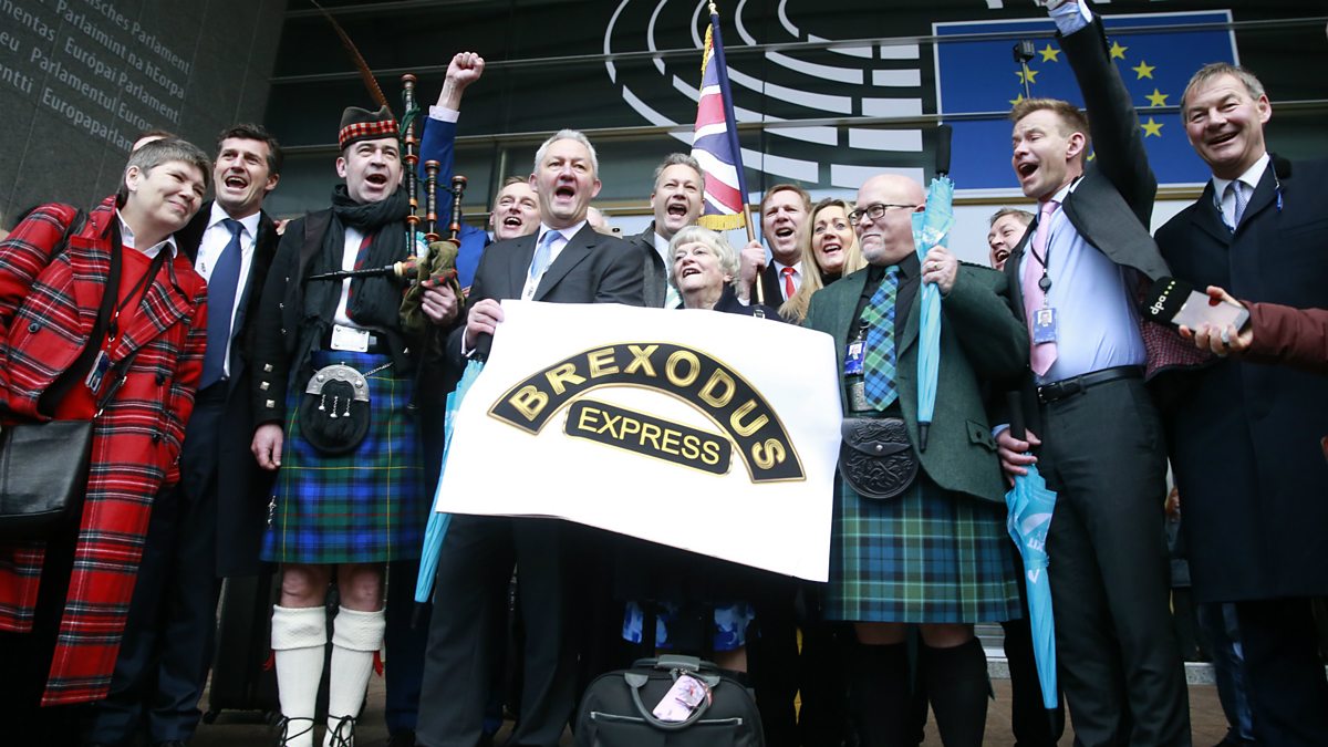 (Picture: British Members of the European Parliament react as they leave the EU Parliament for the last time in Brussels on 31 January 2020. Credit: EPA/Stephanie Lecocq)
