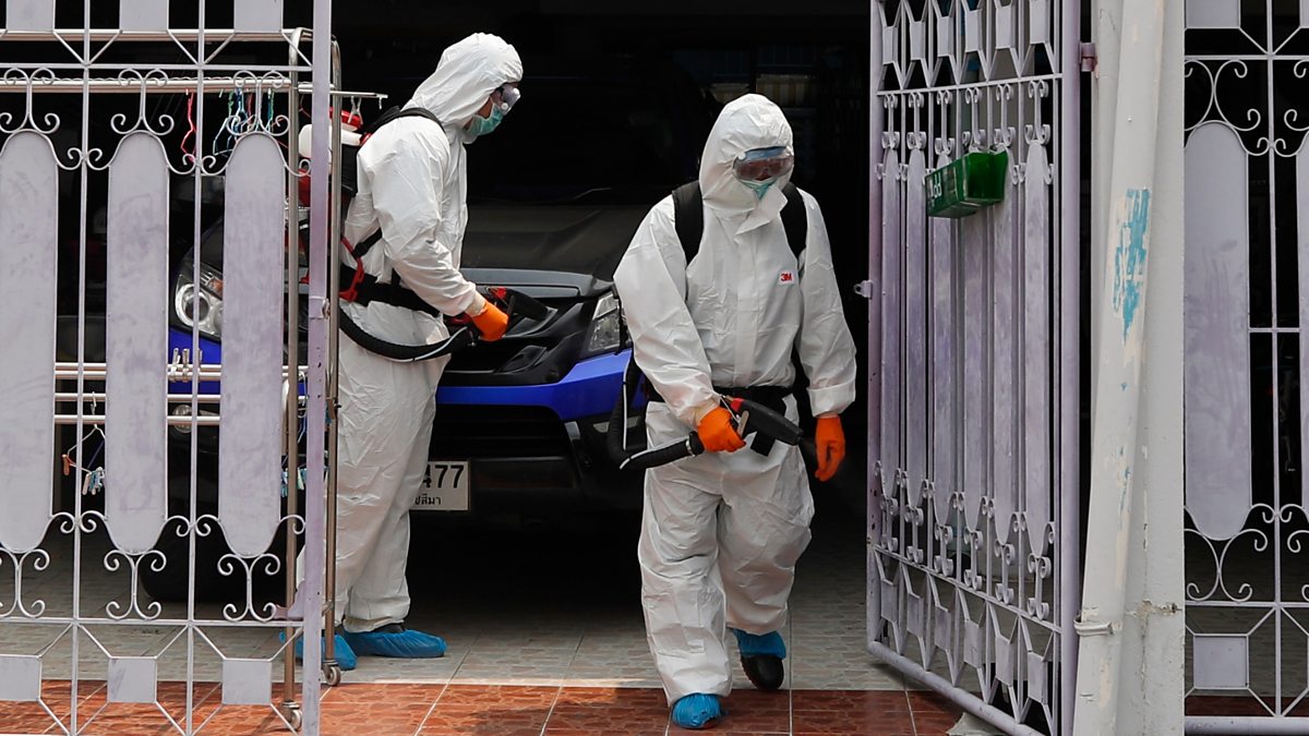 (Photo: Thai health officers wearing protective suits spray disinfectant in the house of a family who tested positive for Covid-19, in a residential area in Bangkok, Thailand. Credit: EPA/Rungroj Yongrit)