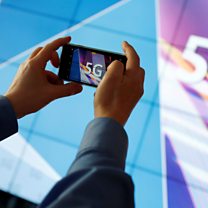 (Image: A journalist uses a mobile phone to take a picture of the 5G logo. Credit: Reuters)