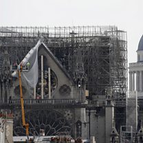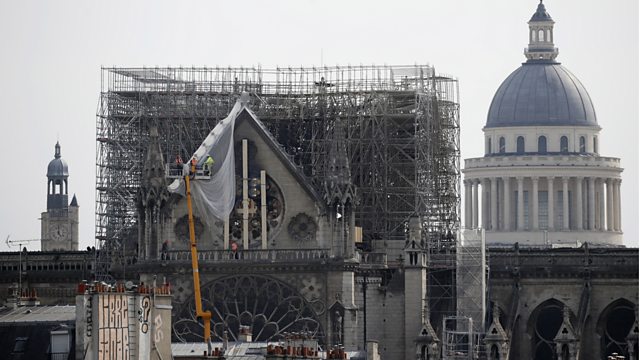 (Image: Workers consolidate the North face of Notre-Dame in the aftermath of a fire that devastated the cathedral in Paris. Credit: EPA)
