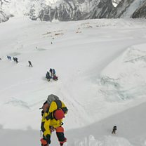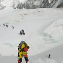 (Image: mountaineers walk near camp two of Mount Everest. Credit: Phunjo Lama/AFP/Getty Images)