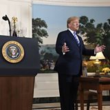 (Photo: US President Donald Trump announces his decision on the Iran nuclear deal in the Diplomatic Reception Room at the White House in Washington DC, on 8th May 2018. Credit: Saul Loeb/AFP/Getty Images)