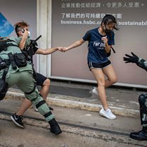 (Image: Police chase down a couple wearing face masks in Hong Kong. Credit: Getty Images)