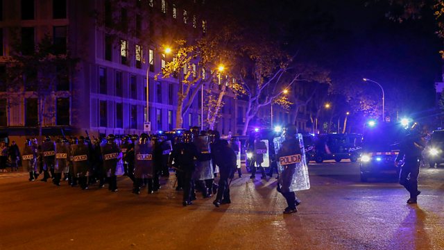 (Image: Police stand guard in Barcelona during a civil disobedience protest ahead of Spain's general election. Credit: Reuters)