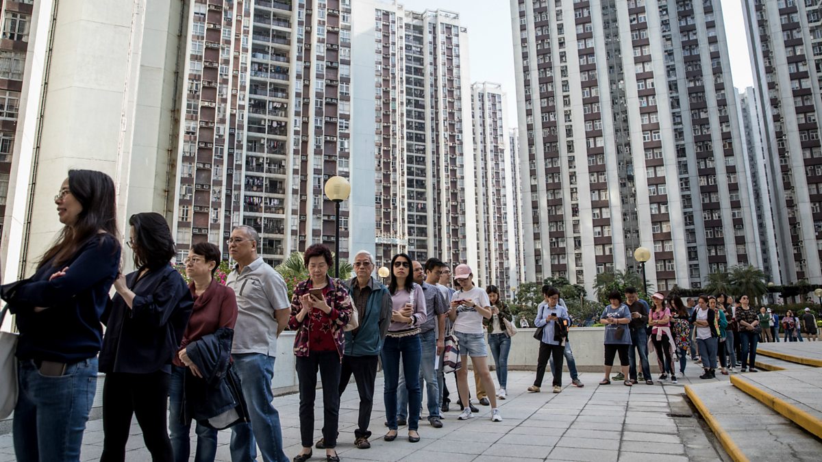 (Image: People line up at a polling station to vote in the Hong Kong District Council elections. Credit: Getty Images)