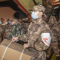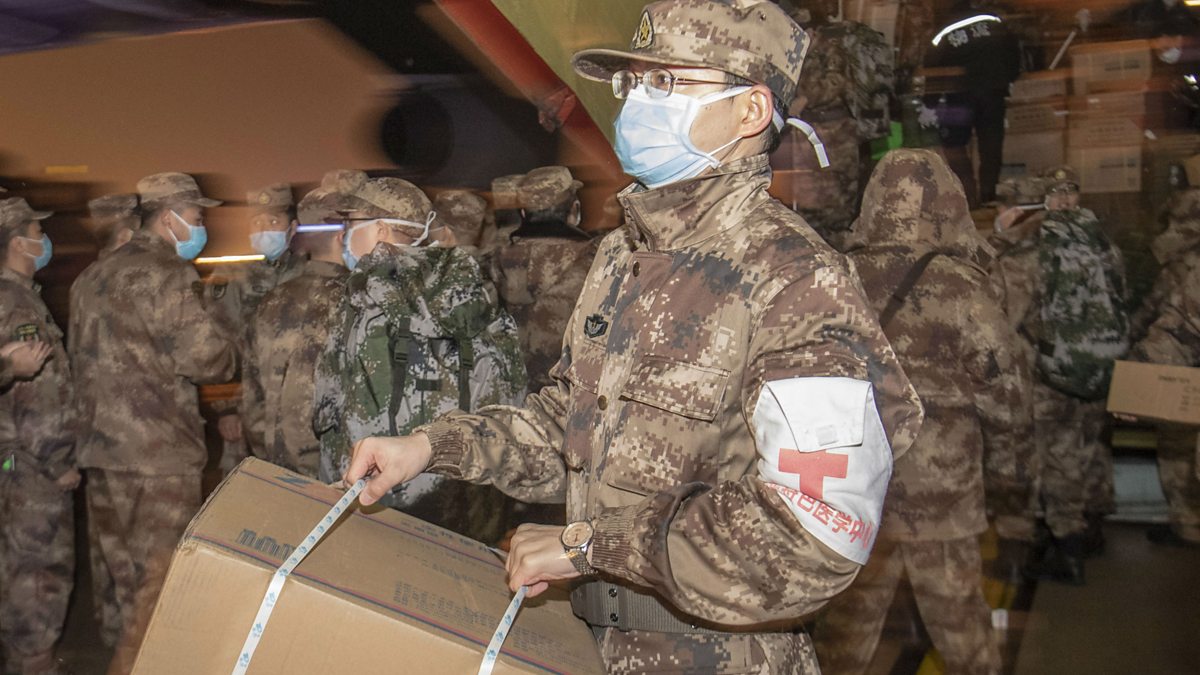 (Image: Chinese military medics arrive with medical supplies at Wuhan Airport. Credit: EPA/STR CHINA OUT)