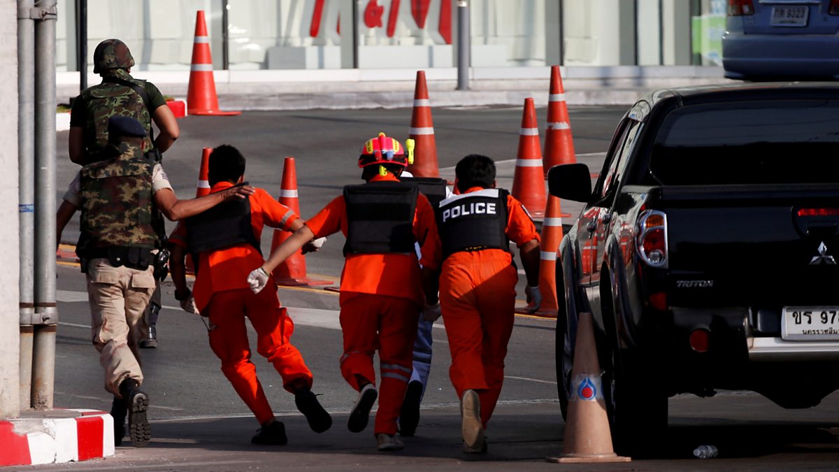 (Photo: Soldiers cover rescue workers as they proceed to enter Terminal 21 shopping mall following a gun battle involving a Thai soldier on a shooting rampage. Credit: Reuters)