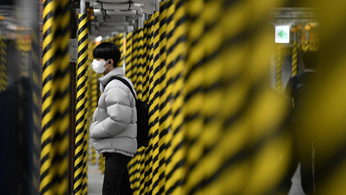 (Photo: A man wearing a face mask walks between columns at a subway station being renovated in Seoul. Credit: Getty Images)