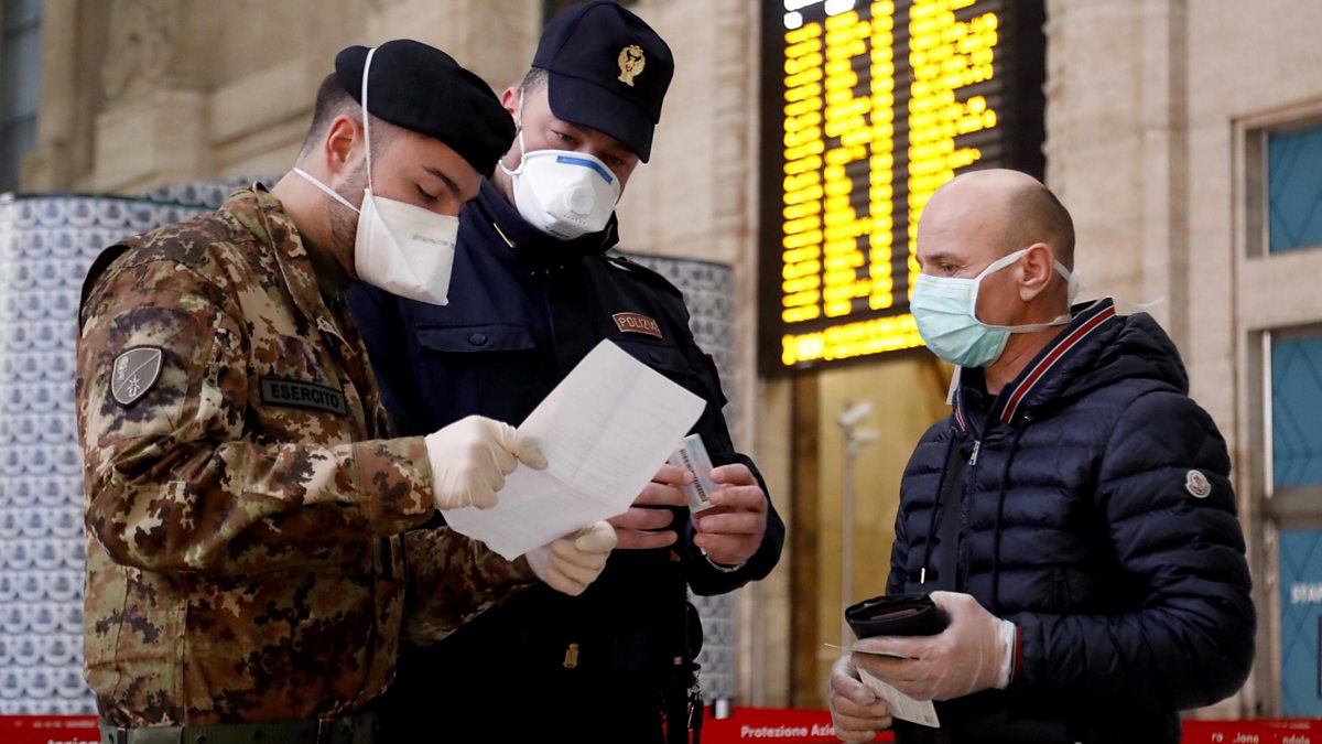 Photo: Police and military checks at Central station during the coronavirus emergency lockdown, in Milan, Italy, 20 March 2020 (CREDIT: EPA/MOURAD BALTI TOUATI)