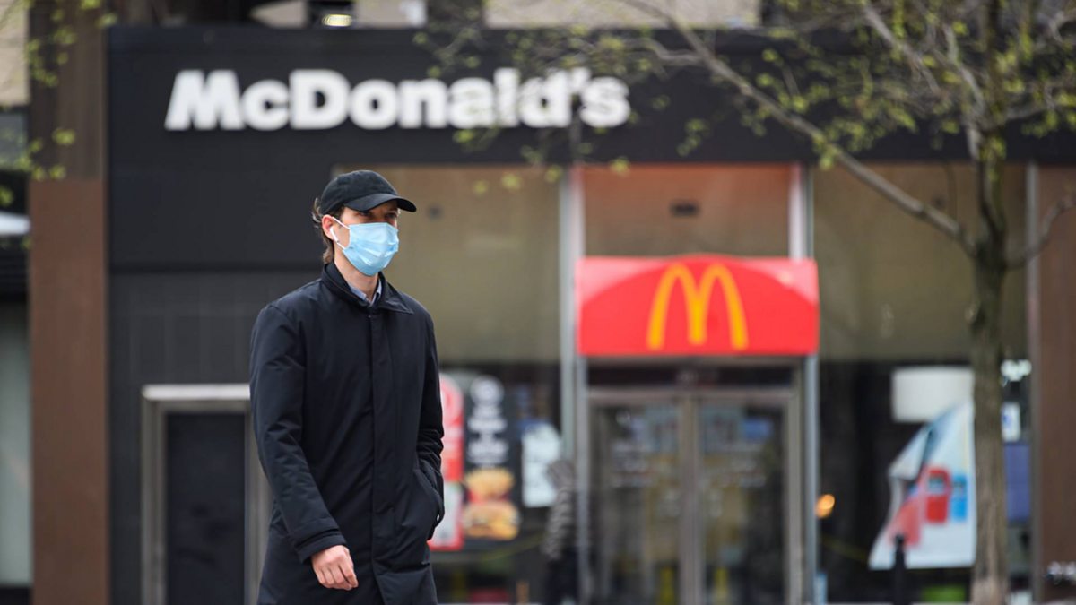 (Image: Man wearing face mask walking in front of New York McDonald's, Credit: Getty Images)