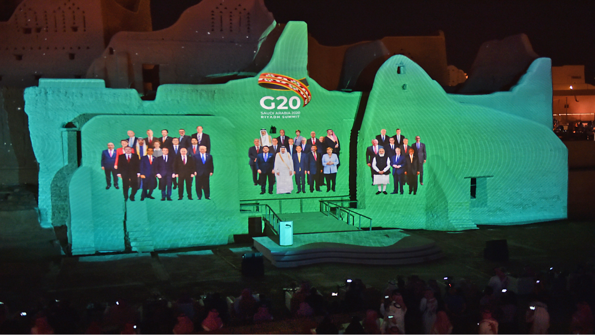 (Picture: a family photo of G20 Leaders is projected at the historic site of al-Tarif in Diriyah district, on the outskirts of Saudi capital Riyadh. Picture credit: Getty Images.)