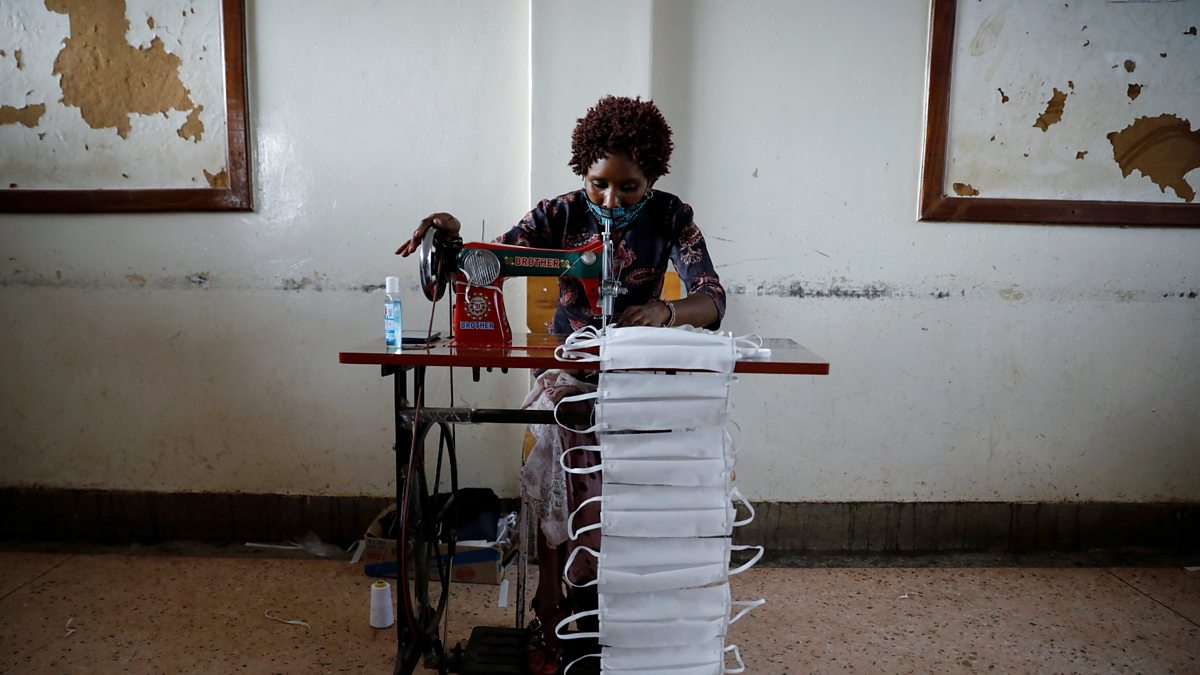 (Photo: A woman uses a sewing machine to manufacture face masks at an educational centre in the Kibera slums of Nairobi, Kenya. Credit: Baz Ratner/Reuters)