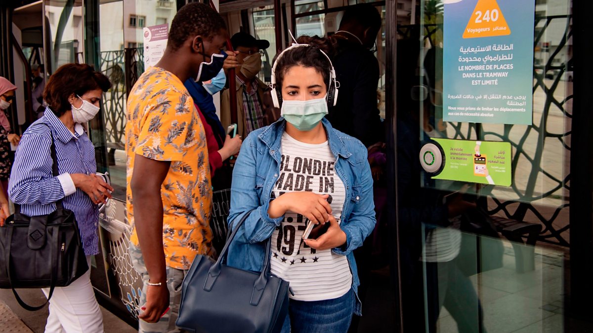 Photo: A woman wearing a protective mask steps off a tram in the center of the Moroccan capital Rabat (FADEL SENNA/AFP via Getty Images).