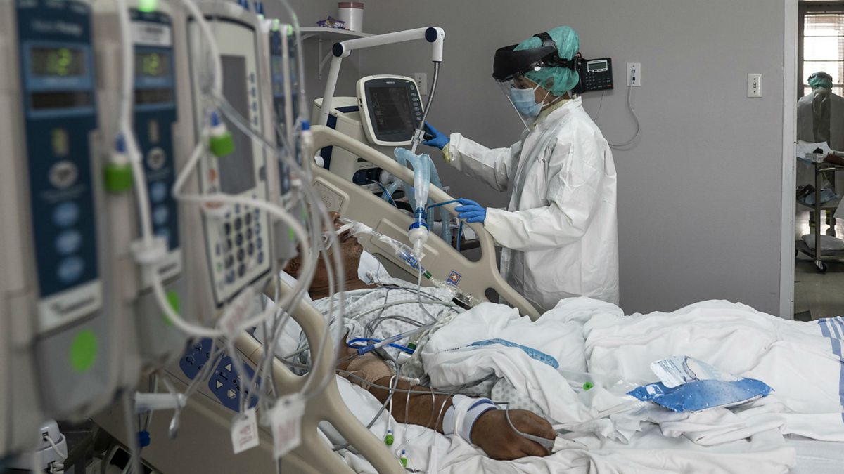 (Photo: A member of the medical staff wearing full PPE treats a patient in the Covid-19 intensive care unit at the United Memorial Medical Center in Houston, Texas. Credit: Go Nakamura/Getty Images)
