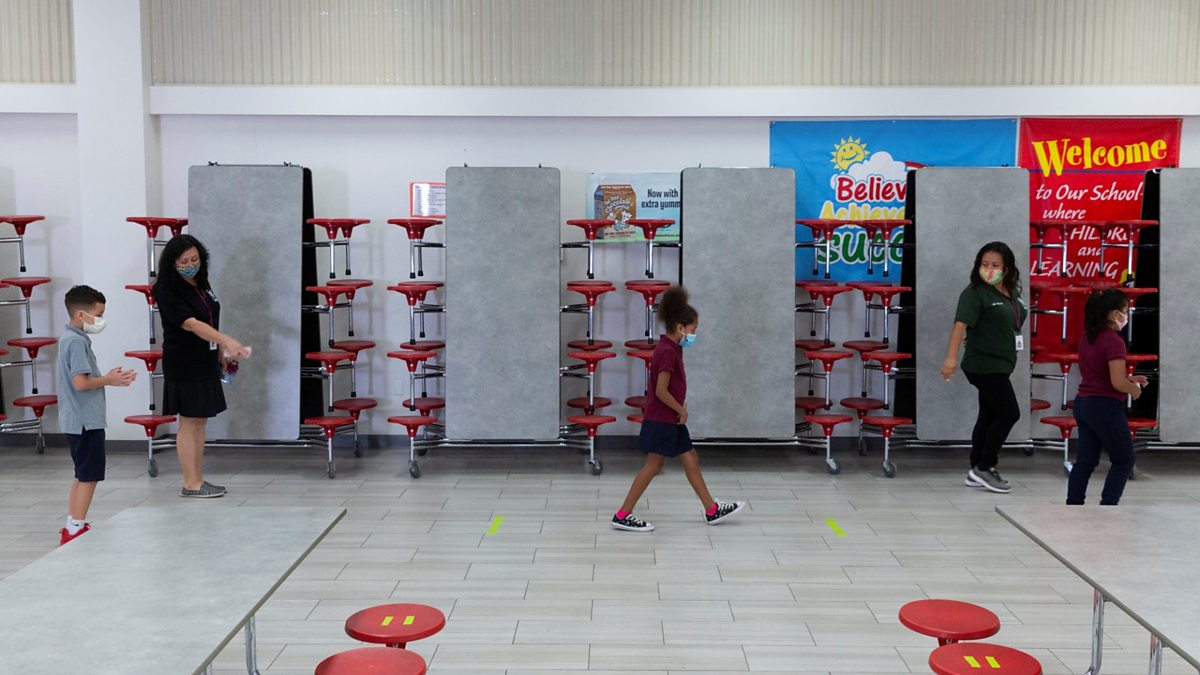 Picture Credit: Instructional assistants sanitize the classroom an help students as in-person learning resumes with restrictions in place to prevent the spread of coronavirus disease at a school in Arizona. REUTERS/Cheney Orr