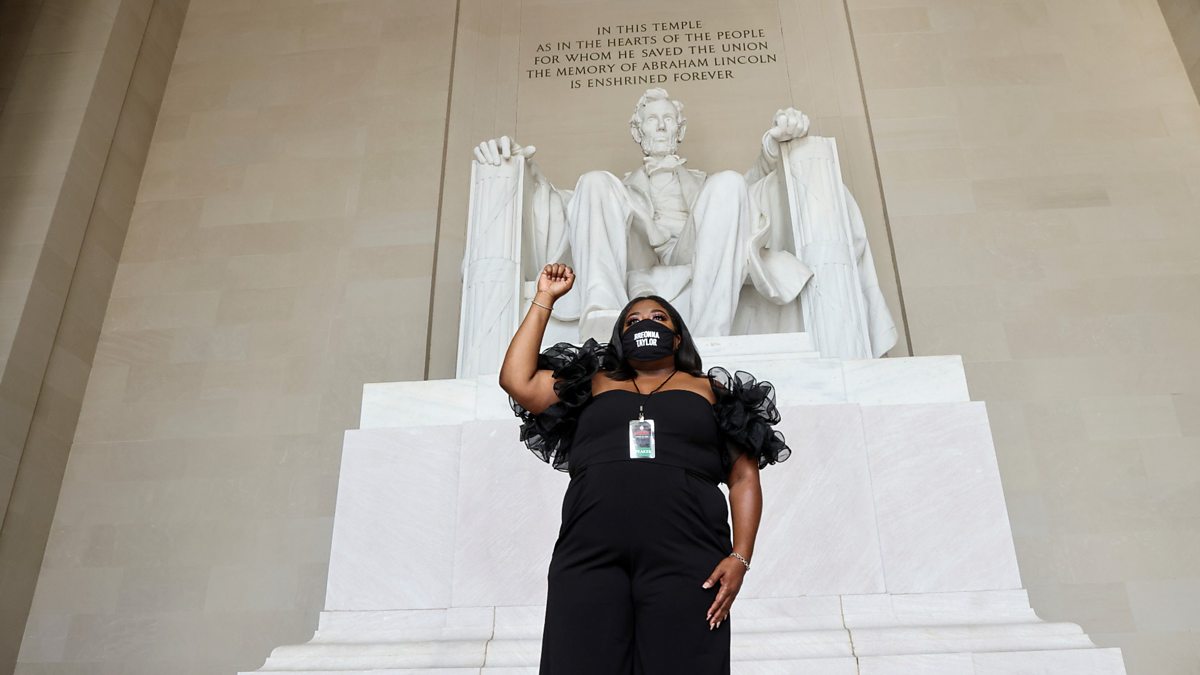 Picture: DeJuana Thompson from the organisation "Woke Vote", wears a Breonna Taylor face mask while waiting inside the Lincoln Memorial as demonstrators gather for the "Get Your Knee Off Our Necks" March on Washington DC. (REUTERS/Jonathan Ernst/Pool)