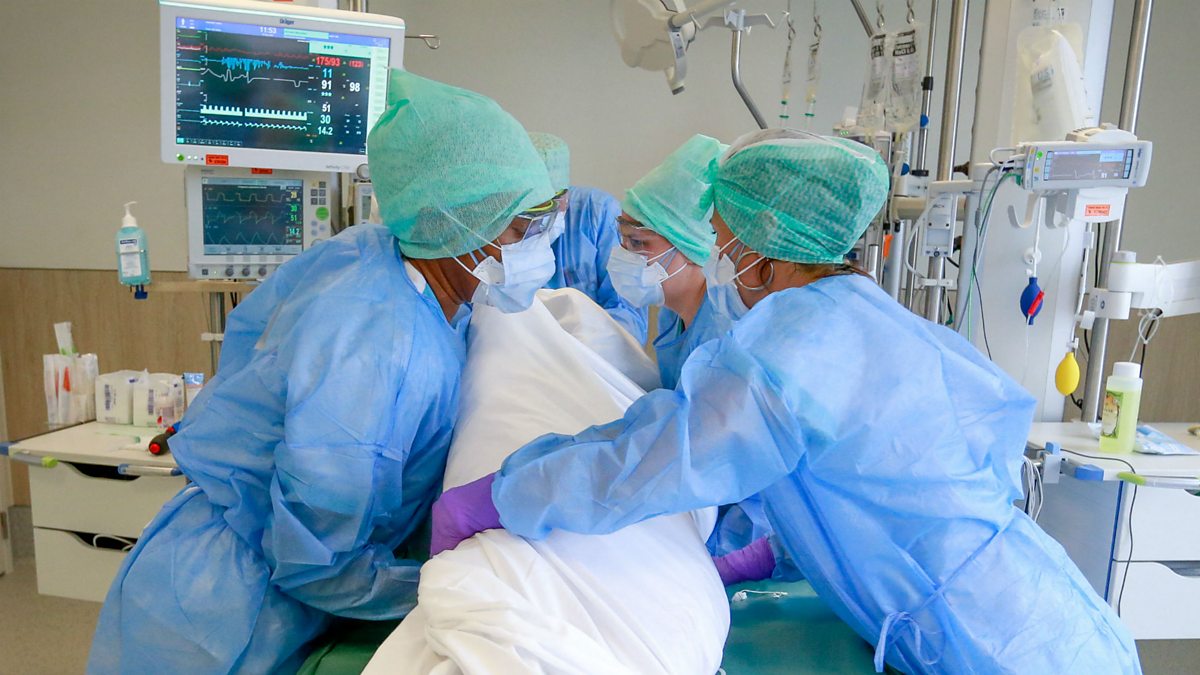 (Photo: Nurses turn a patient with COVID-19 from prone to supine position as part of care in the intensive care unit at the Etterbeek-Ixelles site of the Iris Sud Hospitals in Brussels, Belgium Credit: STEPHANIE LECOC/EPA)