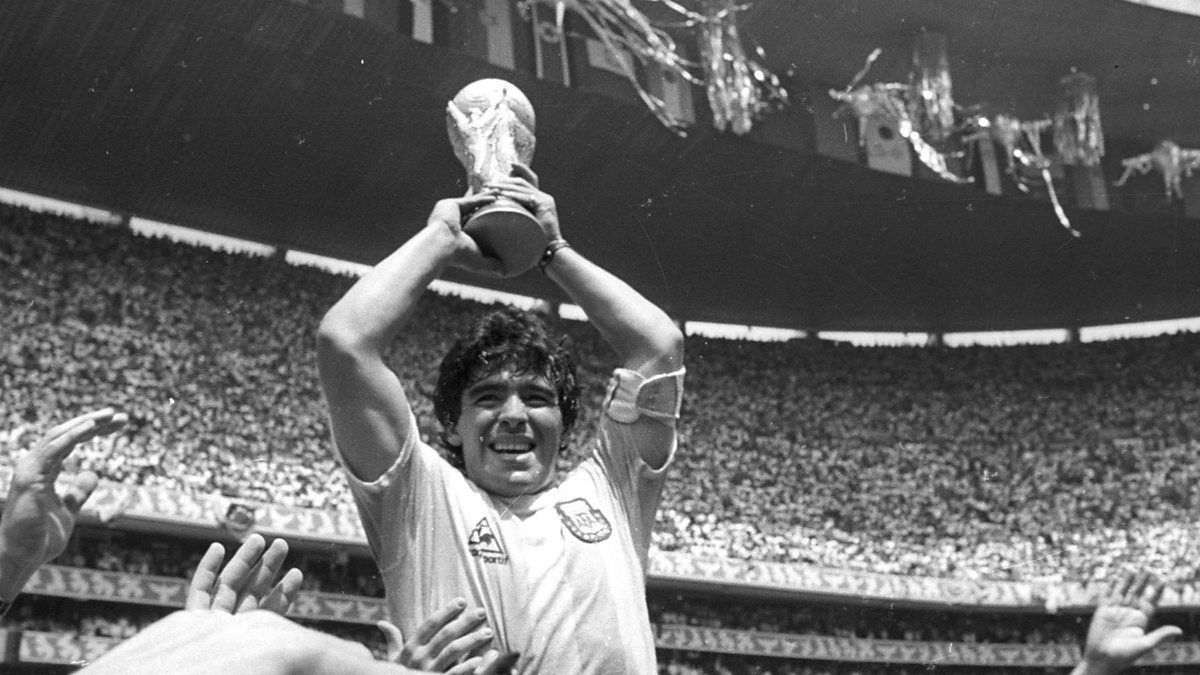 (Photo: Argentine star Diego Maradona holds up the World Cup trophy as he is carried off the field after Argentina defeated West Germany 3-2 to win the World Cup soccer championship in Mexico City June 29, 1986 Credit: Gary Hershorn/File Photo/File Photo/Reuters)
