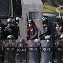 (Photo: Riot police stand guard during a protest against the military coup in Naypyitaw, Myanmar, 09 February 2021.Credit: EPA/Maung Lonlan)
