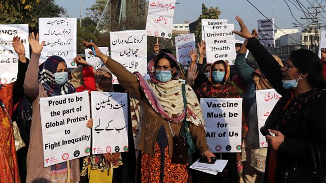 (Photo: Women hold placards to demand fair distribution of vaccines to developing countries during a protest in Lahore, Pakistan, 29 January Credit: RAHAT DAR/EPA