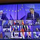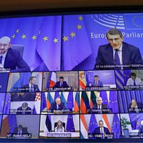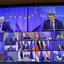 (Photo: European Council President Charles Michel and European Parliament President David Sassoli with other EU leaders on a screen at the start of a EU Council two-days video conference on the COVID-19 pandemic. Credit: EPA/Olivier Hoslet)