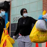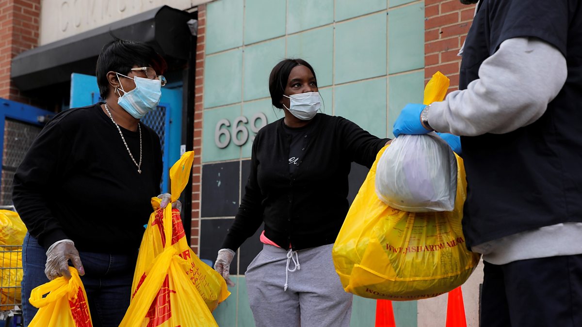 (Photo: Volunteers with the Central Harlem NYCHA distribute food packs at the Frederick E. Samuel Community Centre during the coronavirus disease outbreak in Harlem, Manhattan, New York City. Reuters/Andrew Kelly)