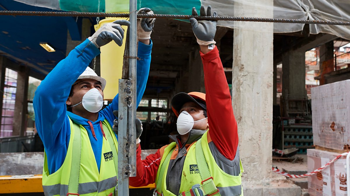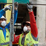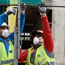 (Photo: Construction workers return to work as the government ease the coronavirus work restrictions on 14 April 2020 in Madrid, Spain. Spain is beginning to ease strict lockdown measures to ease its economy, people in some services including manufacturing, construction are being allowed to return to work but must adhere to strict safety guidelines. More than 17,000 people are reported to have died in Spain due to the COVID-19 outbreak, although the country has reported a decline in the daily number of deaths. Credit: Carlos Alvarez/Getty Images)