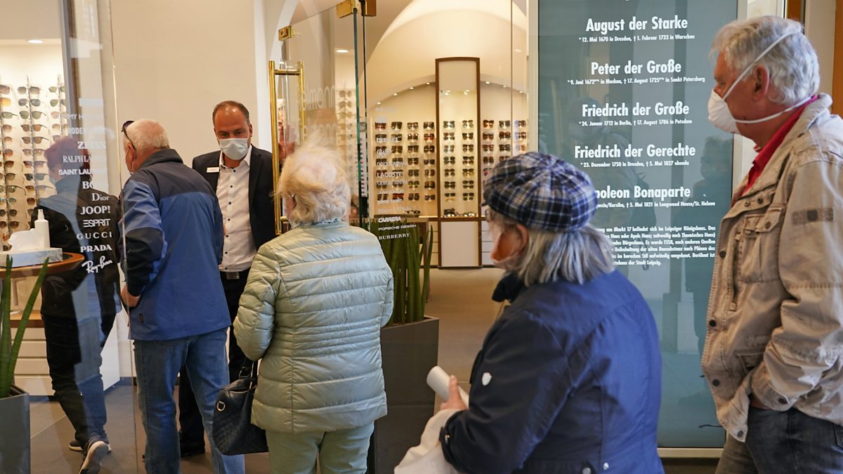 (Photo: Customers prepare to enter a reopened opticians' on the first day of the easing of some restrictions during the coronavirus crisis in Leipzig, Germany.)