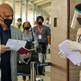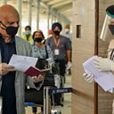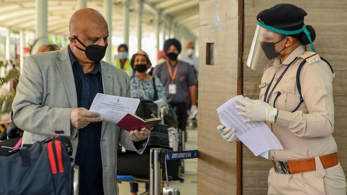 (Picture: A security personnel wearing a face shield (R) checks the passport of a British national before check-in for a special flight to London during a government-imposed nationwide lockdown as a preventive measure against the COVID-19 coronavirus, at the Sri Guru Ram Dass Jee International Airport in Amritsar on April 25, 2020. Credit: Narinder Nanu/AFP via Getty Images)